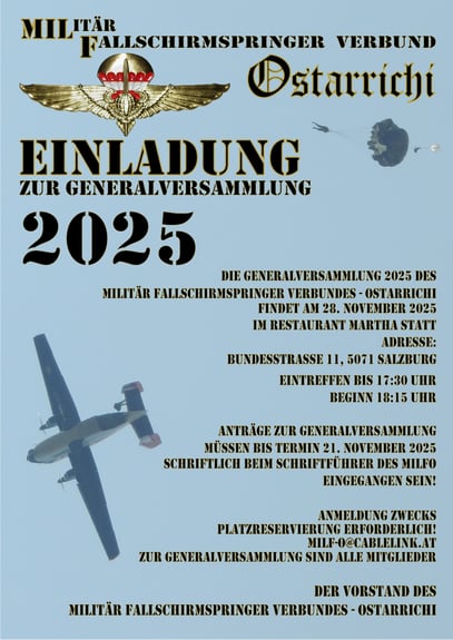 Für Mitglieder des Militär Fallschirmspringer Verbundes – Ostarrichi 30 €. - Für Nichtmitglieder 40 €.